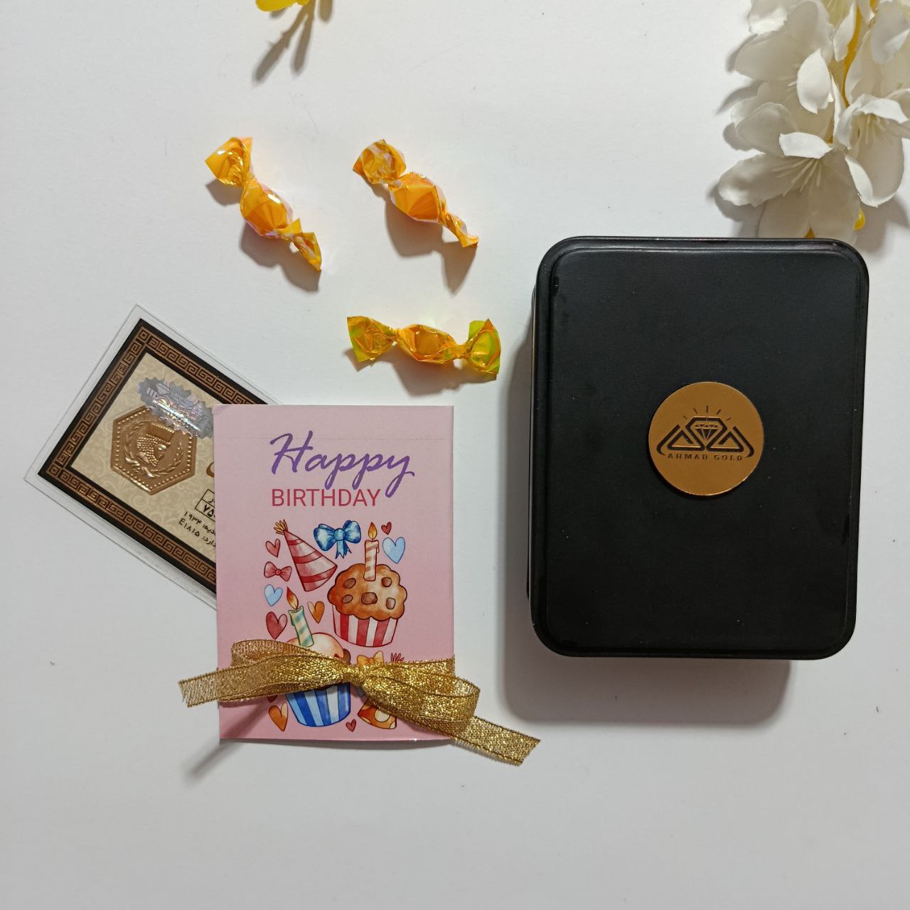 جعبه جنس فلزی درب دار همراه کارت پستال مناسبتی از جنس گلاسه روکش سلفون، مناسب سکه و شمش های کادویی