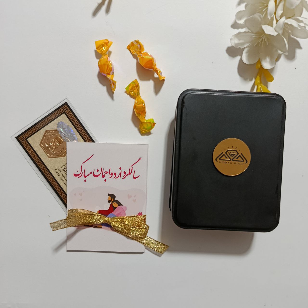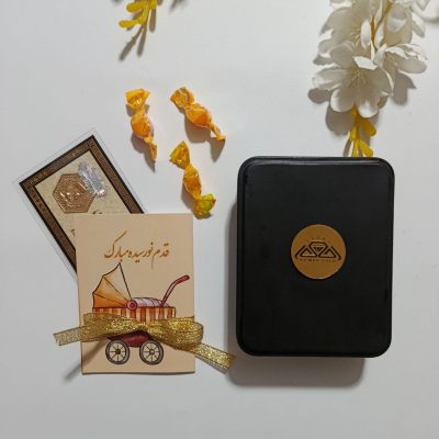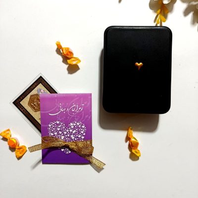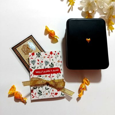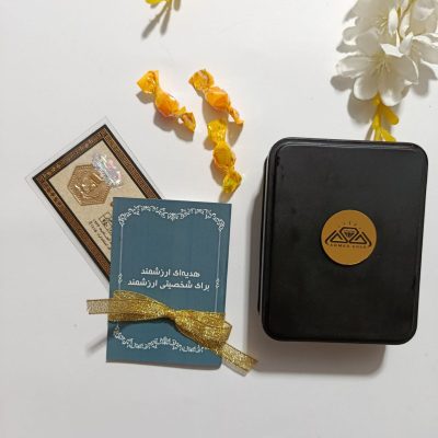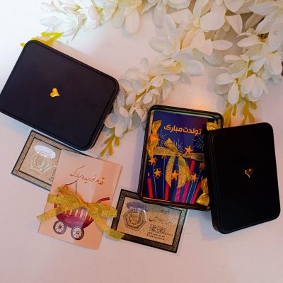 جعبه جنس فلزی درب دار همراه کارت پستال مناسبتی از جنس گلاسه روکش سلفون، مناسب سکه و شمش های کادویی